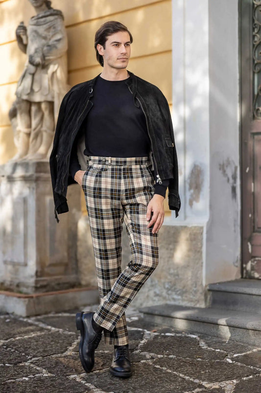 Autumn winter beige and black checked wool flannel trousers