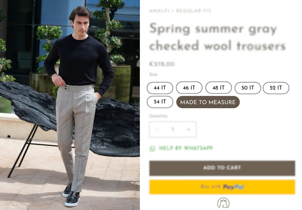 Choose the trousers you prefer, provide 5 simple measurements and receive your tailor-made trousers directly from the tailor's shop in Italy